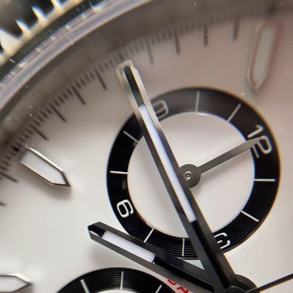 文字盤:カタツムリ状のカウンターを備えた白いダイヤルを特徴