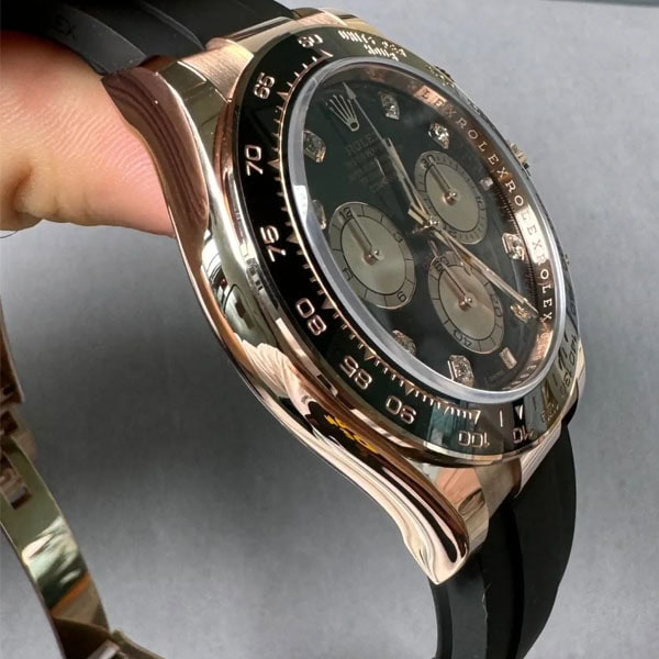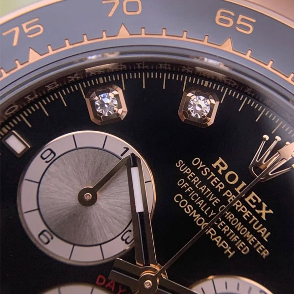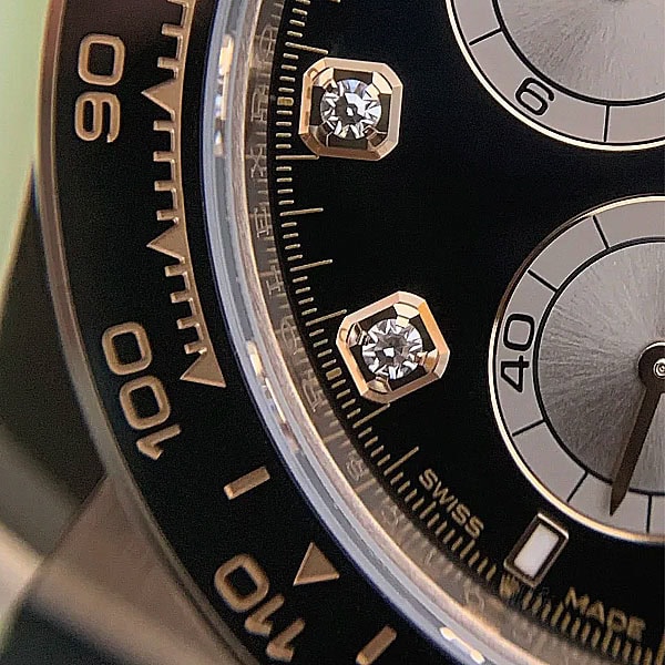 文字盤:ブラック文字盤とローズゴールドのサブダイヤル、モアサナイトダイヤモンドのマーカーが相まって、