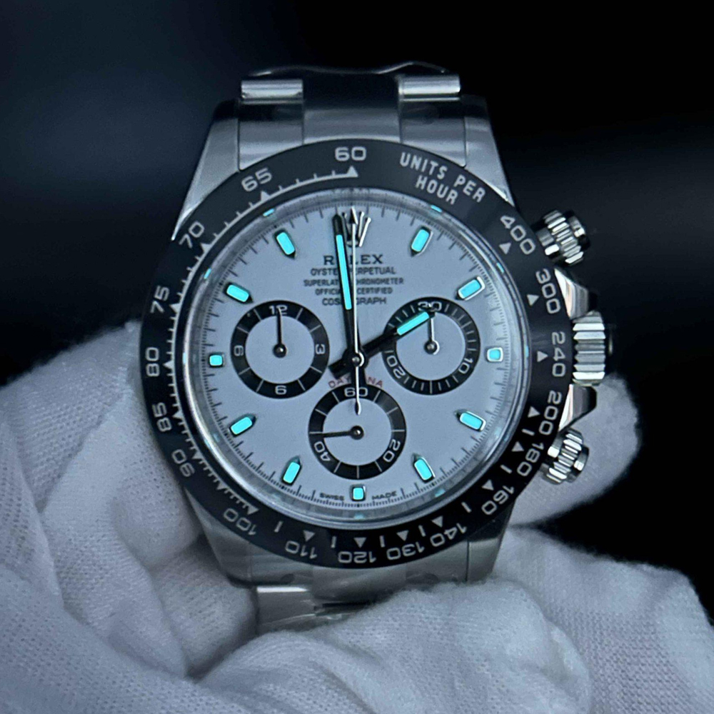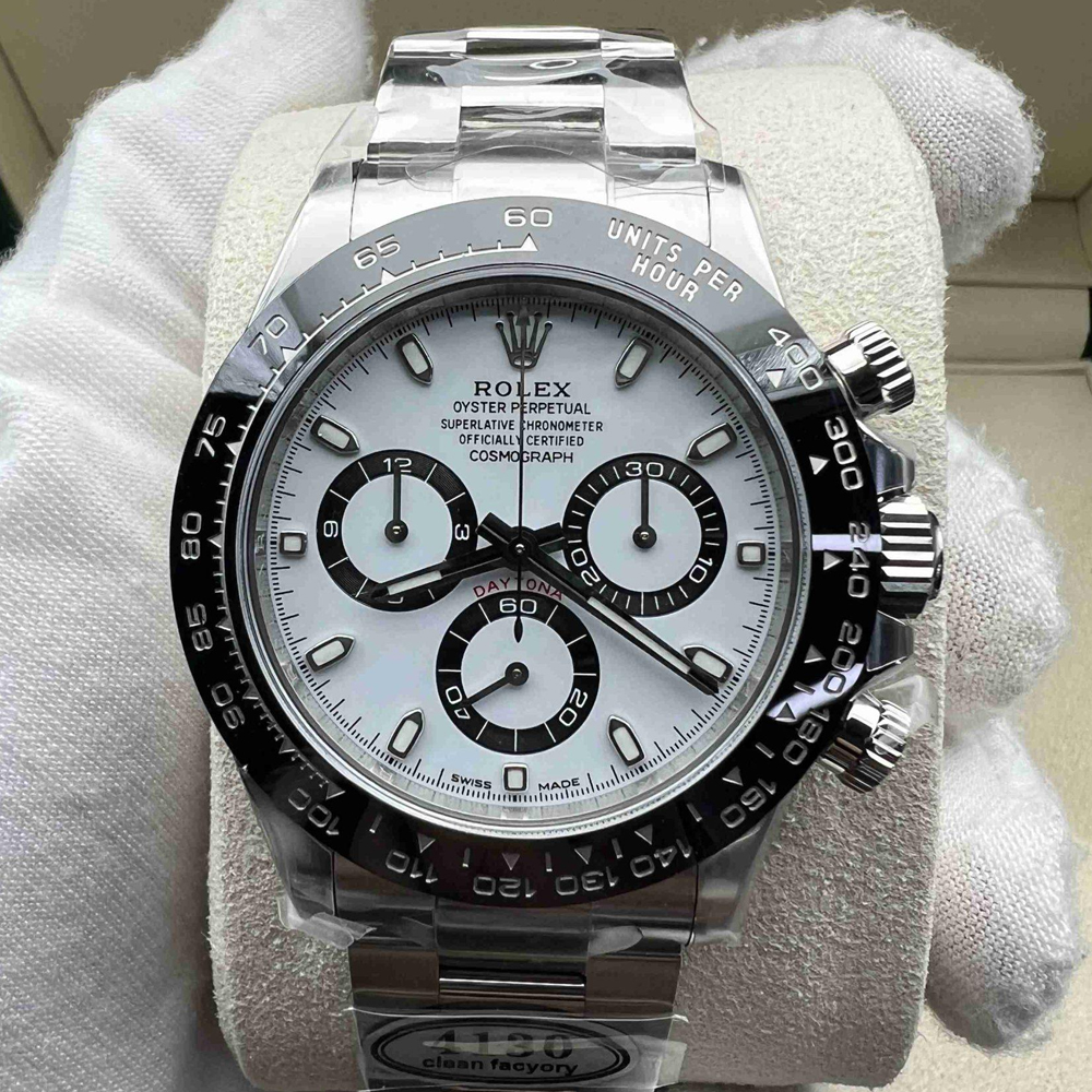 文字盤:デイトナの一番人気「パンダ」文字盤です。文字盤のベースカラーは見事なホワイトカラーで、インダイヤルはブラックカラーのリンクで囲まれています。ワーマーカーと針は明るい夜光スーパールミノバブルー発光蓄光でコーティングされており、夜間で9時間まで均一に明るく発送できます。レーザー精密なテキスから、印刷、彫刻まで、すべてのディテールは正規品と同一です。Cleanファクトリーはアワーマーカーと針に18Kホワイトゴールド コーティングを施し、色落ちは全然無いです。