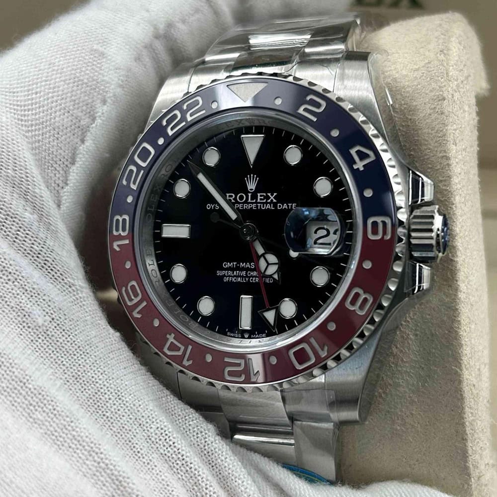 ベゼル:24 クリックで双方向に回転できる24時間両回転ベゼルを備えており、計時の正確性を確保します。耐傷性ある青と赤の2色(ペプシーとも言う)セラクロム セラミック インサートに刻まれた数字と目盛りは本物のプラチナでコーティングされており、時計に高級感を加えます。