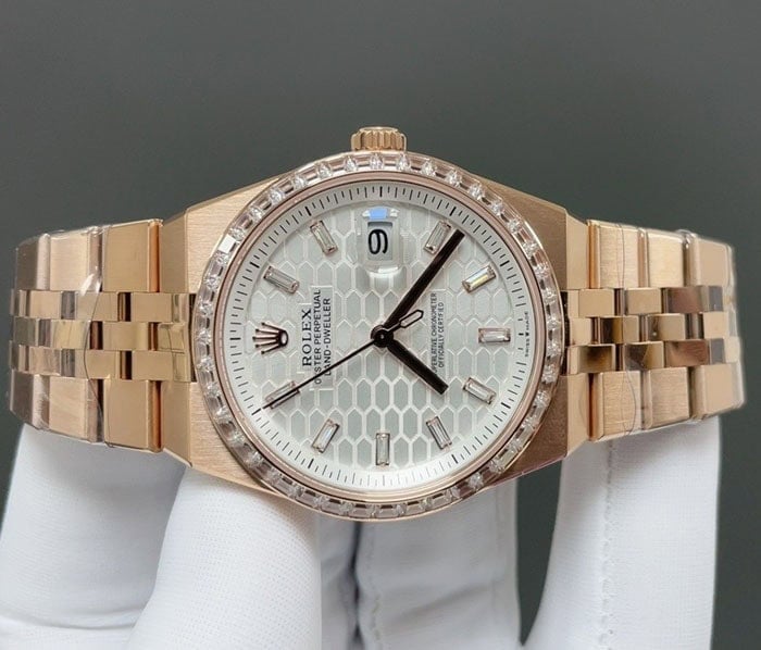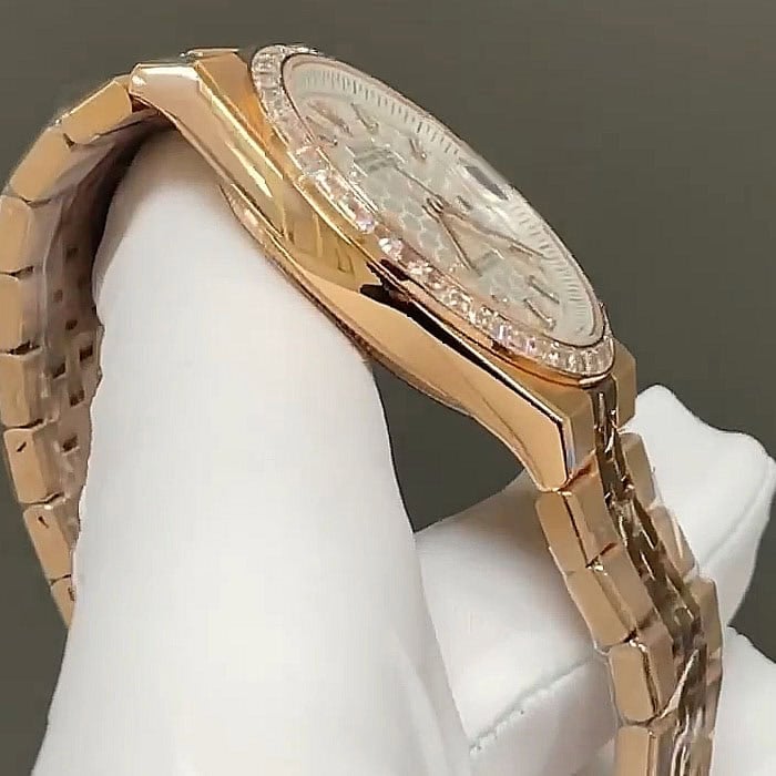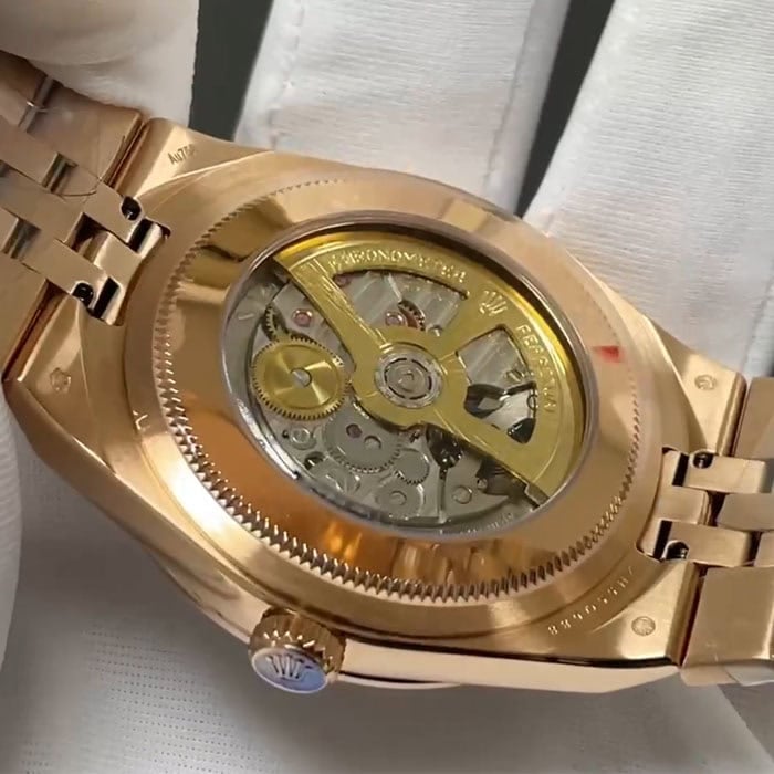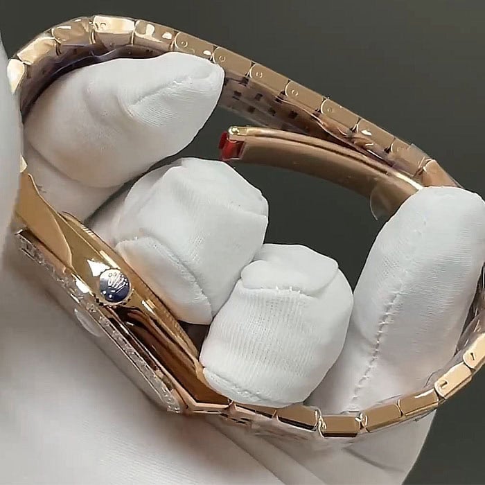 直径40mmに、素材は、ローズゴールドに、ベゼルは、フルーテッドで、リューズは、スクリュー式、