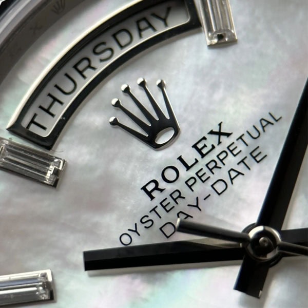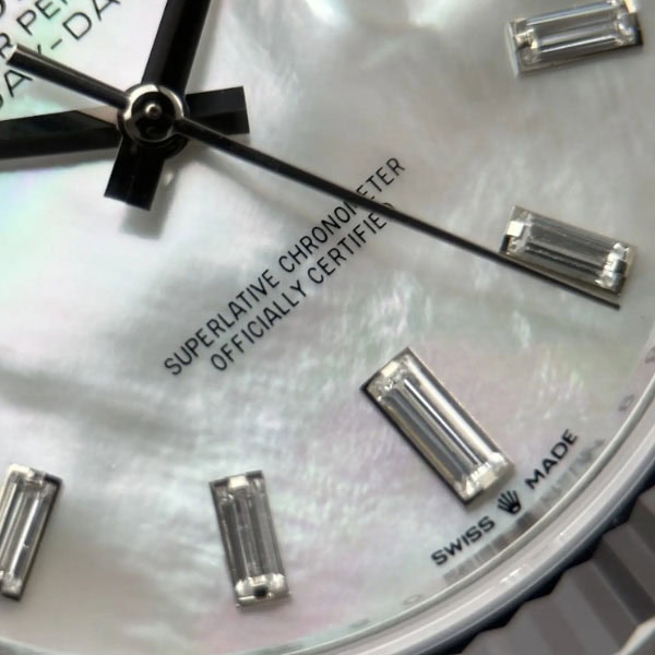 文字盤:マザーオブパール(白)の文字盤には、10個のバゲットカットダイヤモンドがセッティングされています。