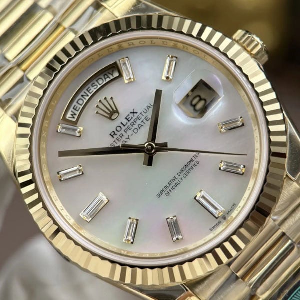 文字盤:マザーオブパール(MOP)の文字盤は、同じものが二つとないユニークな美しさを持っています。10個のバゲットカットダイヤモンド