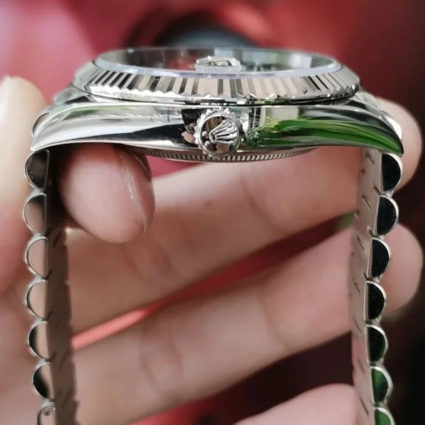 スクリュー式のケースバックとねじ込み式リューズを備え、Rehautリングには「ROLEX ROLEX」のレーザー刻印が施されてい ます。
