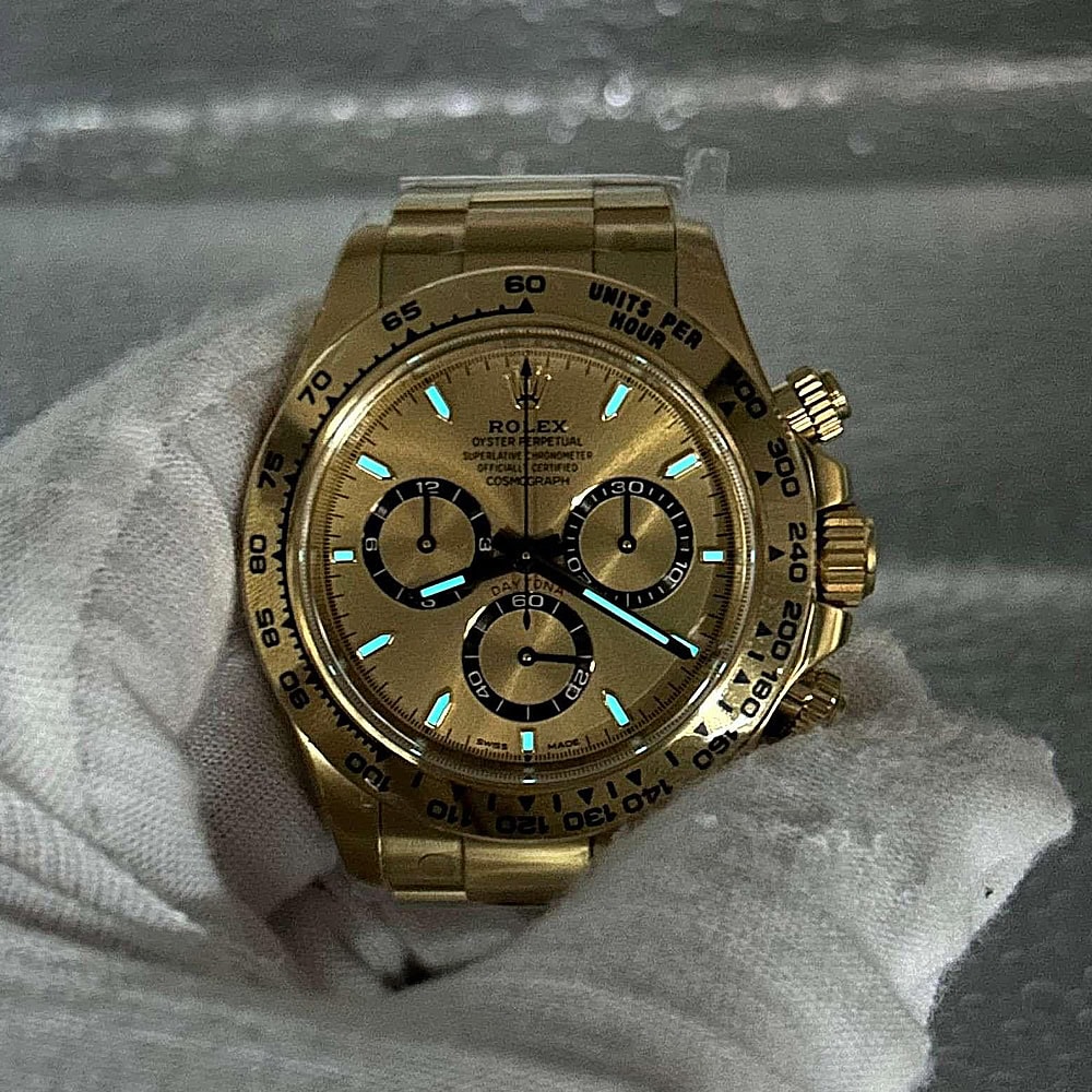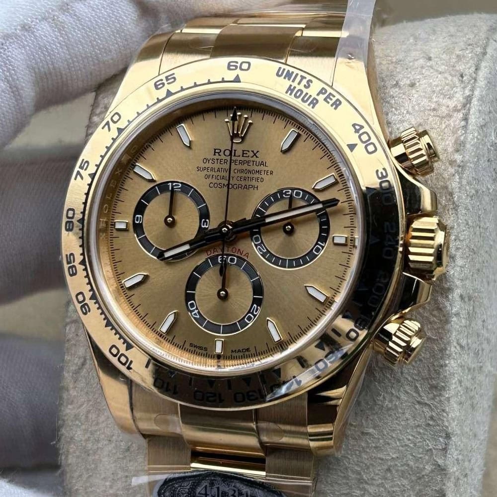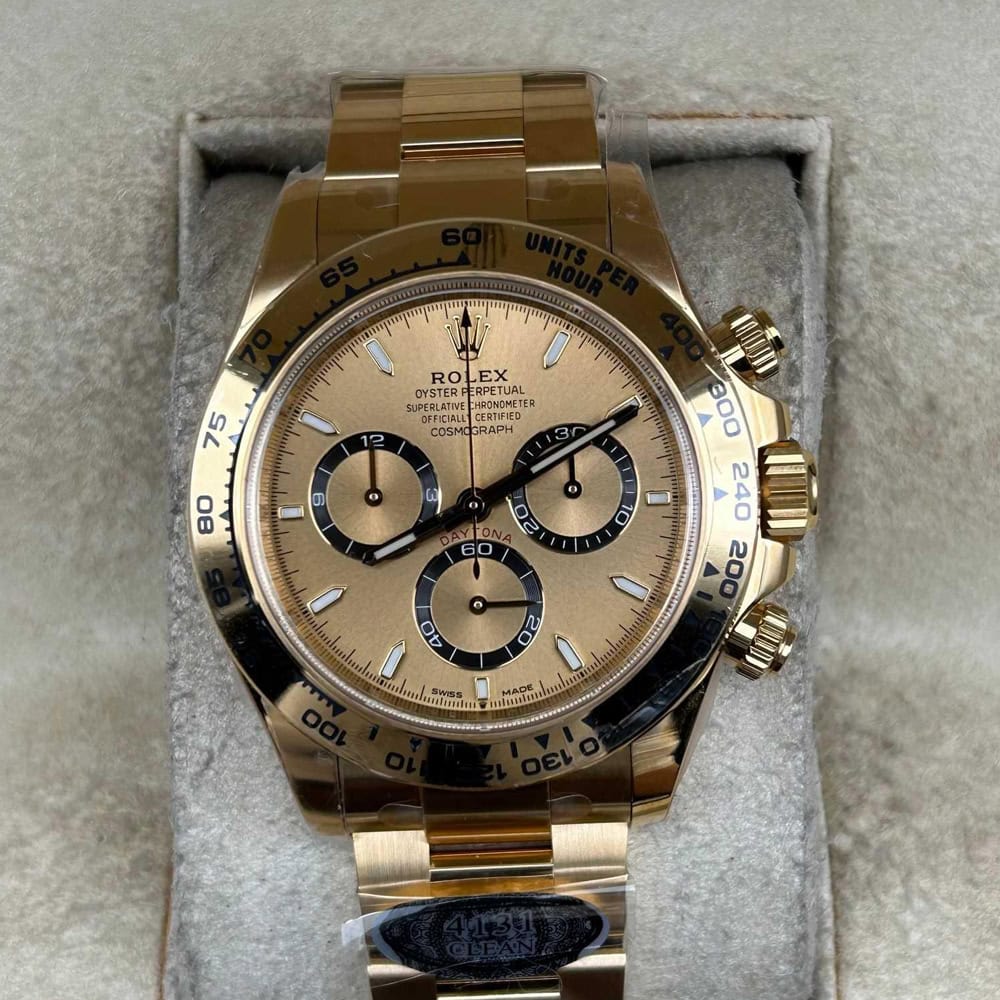 ケース:クリンファクトリーによるこのデイトナは本物18KイエローゴールドPVDコーティング加工された頑丈な904Lステンレススチールによって作りされております。40ミリのケースは完璧に正規品と一致しております。ケースは一体鍛造製法によって作り出されており、滑らかで洗練されたエッジが特徴です。頑丈なねじ込み式リューズはスイス製ラバー・シールと完璧に組み合わされております。RehautにはROLEXROLEXの刻印が刻まれており、あらゆる方面はロレックスデザインを一致しております。