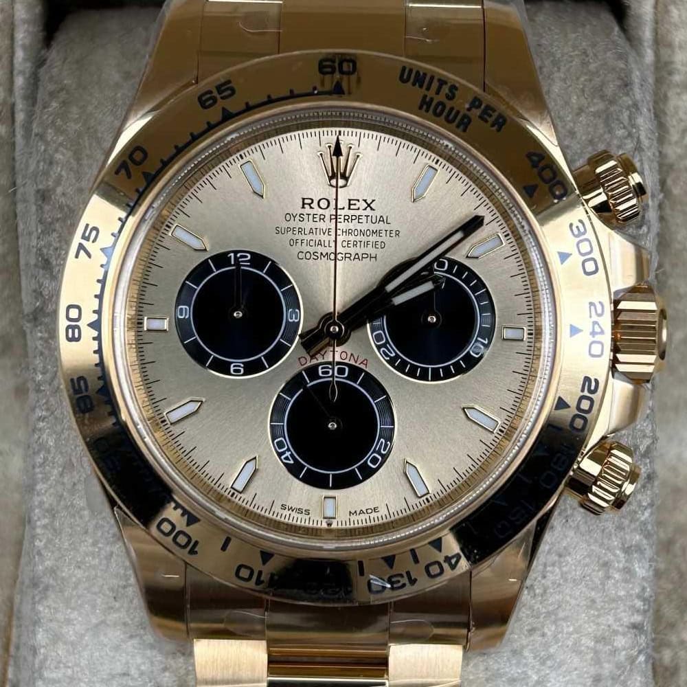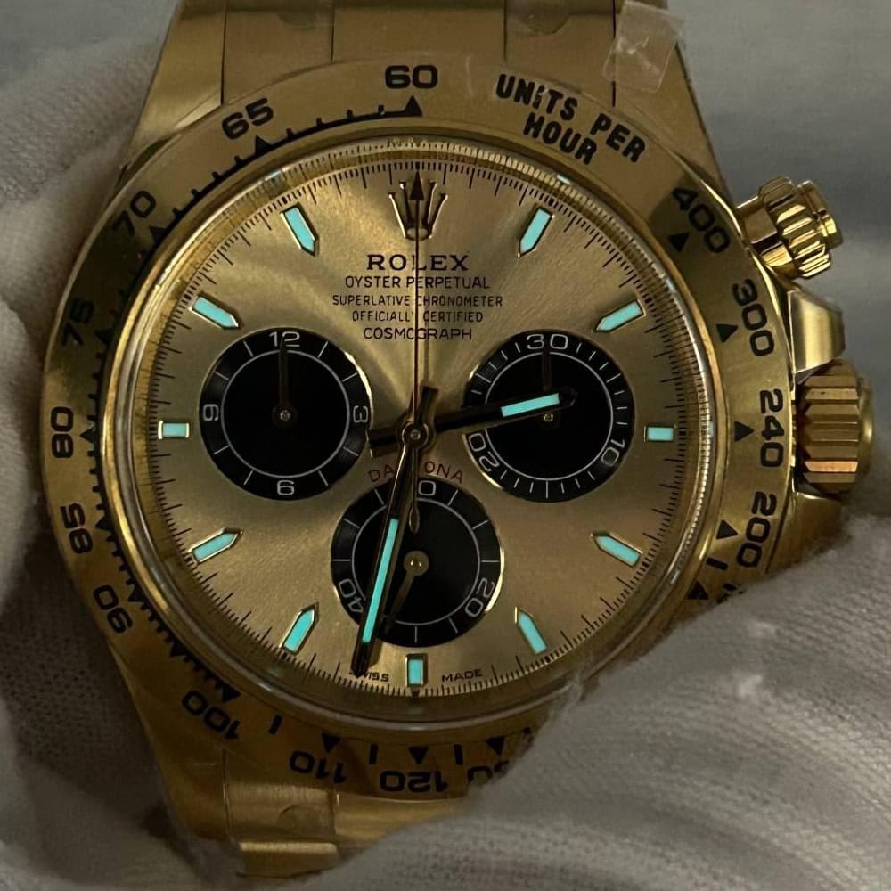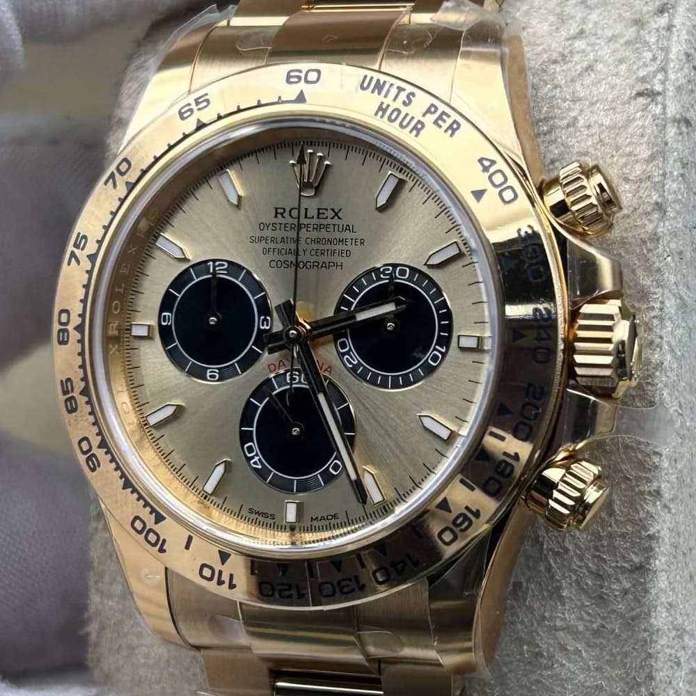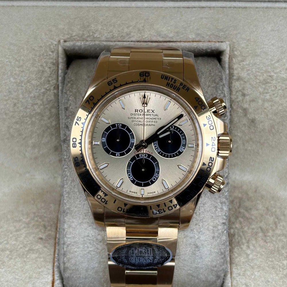 ケース:クリンファクトリーによるこのデイトナは本物18KイエローゴールドPVDコーティング加工された頑丈な904Lステンレススチールによって作りされております。40ミリのケースは完璧に正規品と一致しております。ケースは一体鍛造製法によって作り出されており、滑らかで洗練されたエッジが特徴です。頑丈なねじ込み式リューズはスイス製ラバー・シールと完璧に組み合わされております。RehautにはROLEXROLEXの刻印が刻まれており、あらゆる方面はロレックスデザインを一致しております。