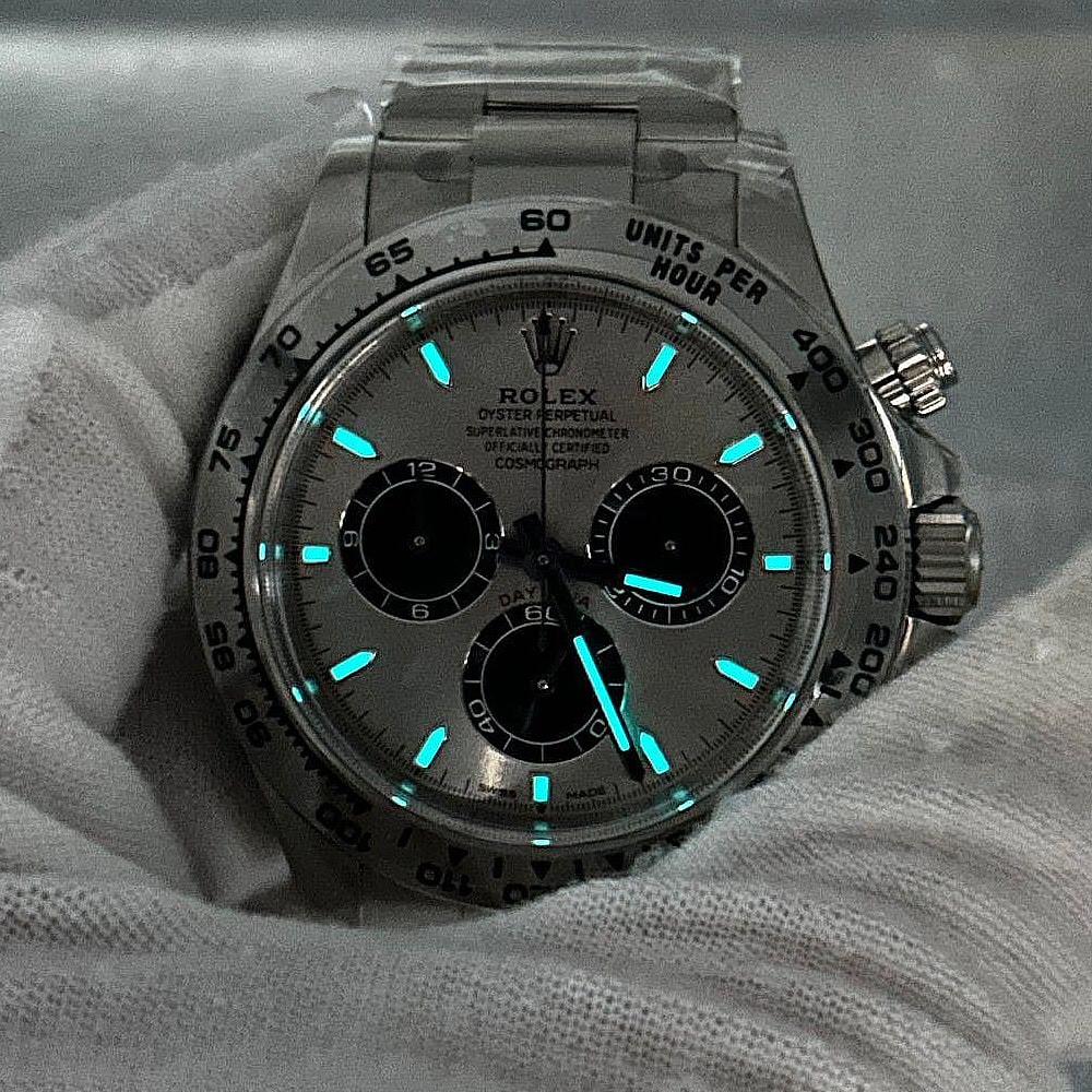 ベゼル:クリーンファクトリーは18Kホワイトゴールドでコーティングされた頑丈な904Lステンレススチール製の固定ベゼルを採用しています。 ベゼルには黒くコーティングされた数字と目盛りが刻まれたタキメータースケールが備わっています。構造とデザインは本物のロレックスと100%一致しています。