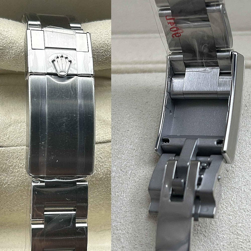 ベルト:オイスター デザインとフラット 3 ピース リンクのブレスレットはソリッド904Lステンレススチールで作り出されており、DLCスクラッチプロティングコーティングを施されています。しっかりとしたネジ山により、楽にベルト調整を実現し、5ミリをコンフォートエクステンションリンク(イージリンクとも言う)を備えた折りたたみ式オイスターロック安全クラスプも備えています。