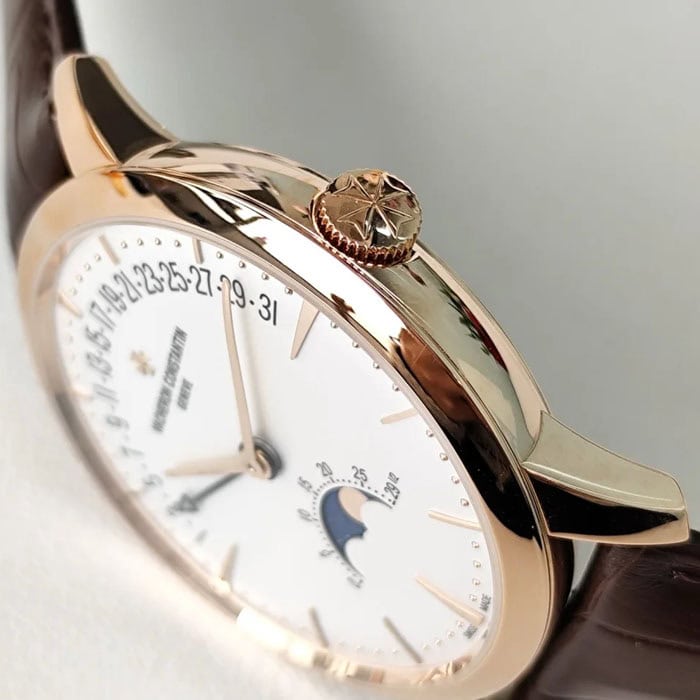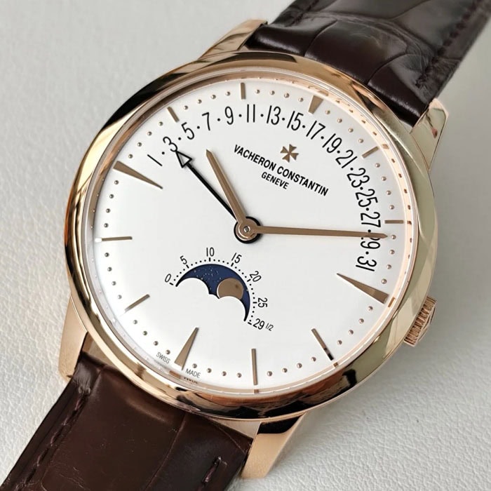 時計の顔は視認性が高く、122年に一度の調整だけで済むこのムーンフェイズは、二つの金色の月と星々が輝く夜空を美しく表現しています。