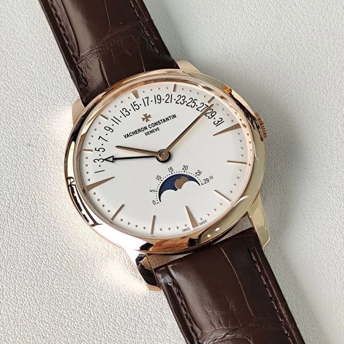 この18Kピンクゴールド製の時計は非常に魅力的で、レトログラード式の日付表示とムーンフェイズのコンビネーションが特徴です。